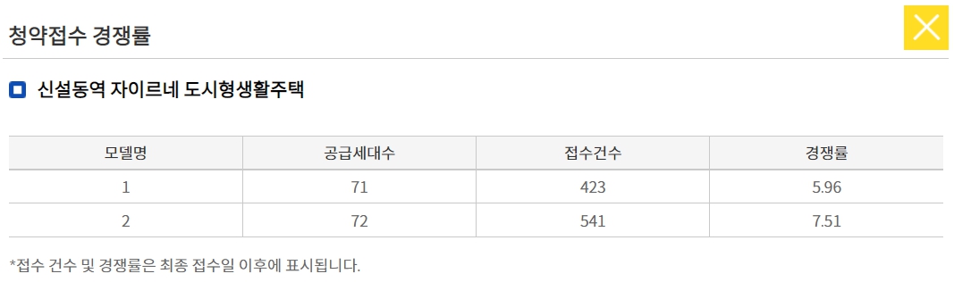 오피스텔의 정당계약이 끝난 후에는 소형주택이라고 하는 도시형생활주택이 5월 9일(월)-10일(화)로 이틀간에 걸쳐 청약 신청이 진행되었으며, 5월 13일(금)에 당첨자 발표를 앞두고 있습니다. 도시형생활주택 또한 청약통장을 사용하지 않기 때문에 낮은 청약가점을 보유중인 분들이나 자녀에게 증여용으로 계획하신 분들에게는 좋은 선택지인데요. 전용면적 42㎡~45㎡에 서비스 면적이라 할 수 있는 발코니 무상확장까지 더한다면 약 20여평의 실사용면적으로 청약 경쟁률은 평균 6.74대 1로 나왔습니다.
