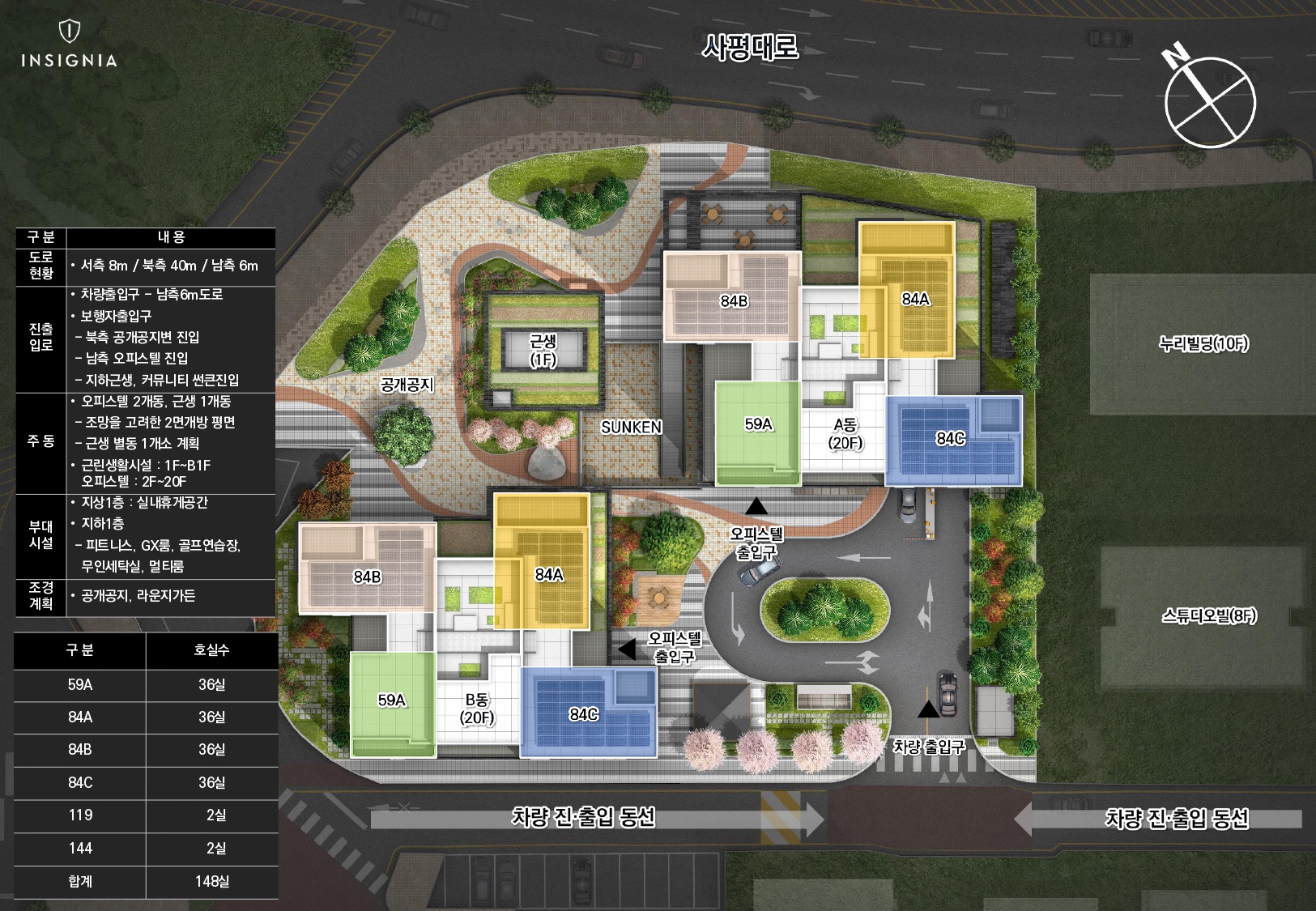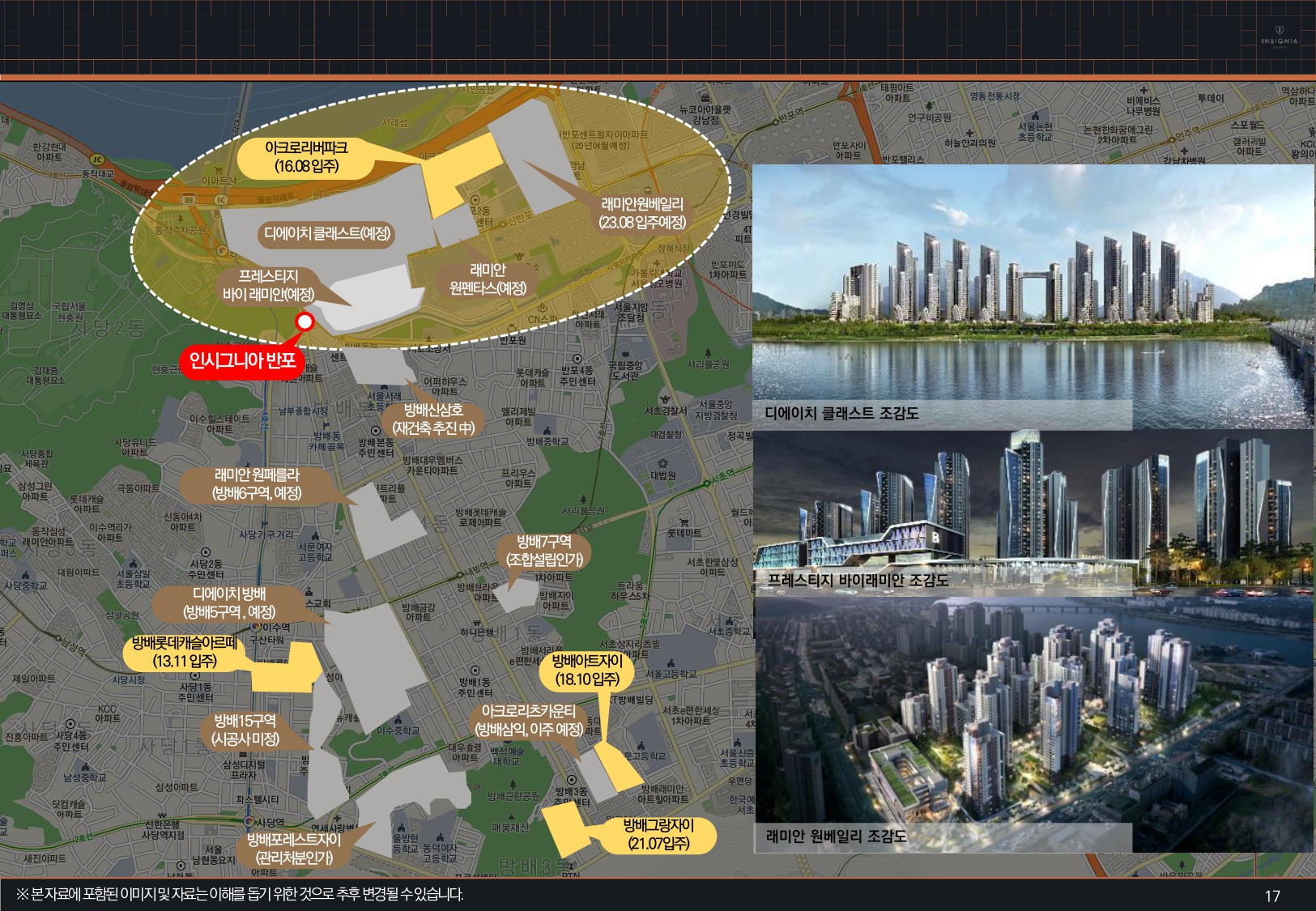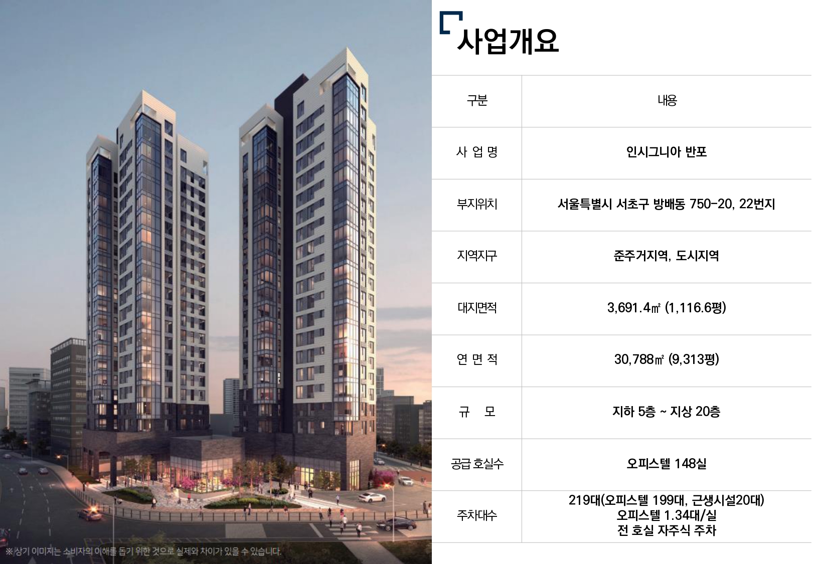오늘 살펴볼 '인시그니시아 반포'는 위에서 말한 현장들의 접점에 위치해있다고 볼 수 있는데요. 서초구 방배동 750-20,22번지에 위치하고 있으며, 대지면적 3691.4㎡(1116.6평)에 지하 5층 ~ 지상 20층, 2 개동, 총 148실의 3룸 오피스텔로 건축됩니다.