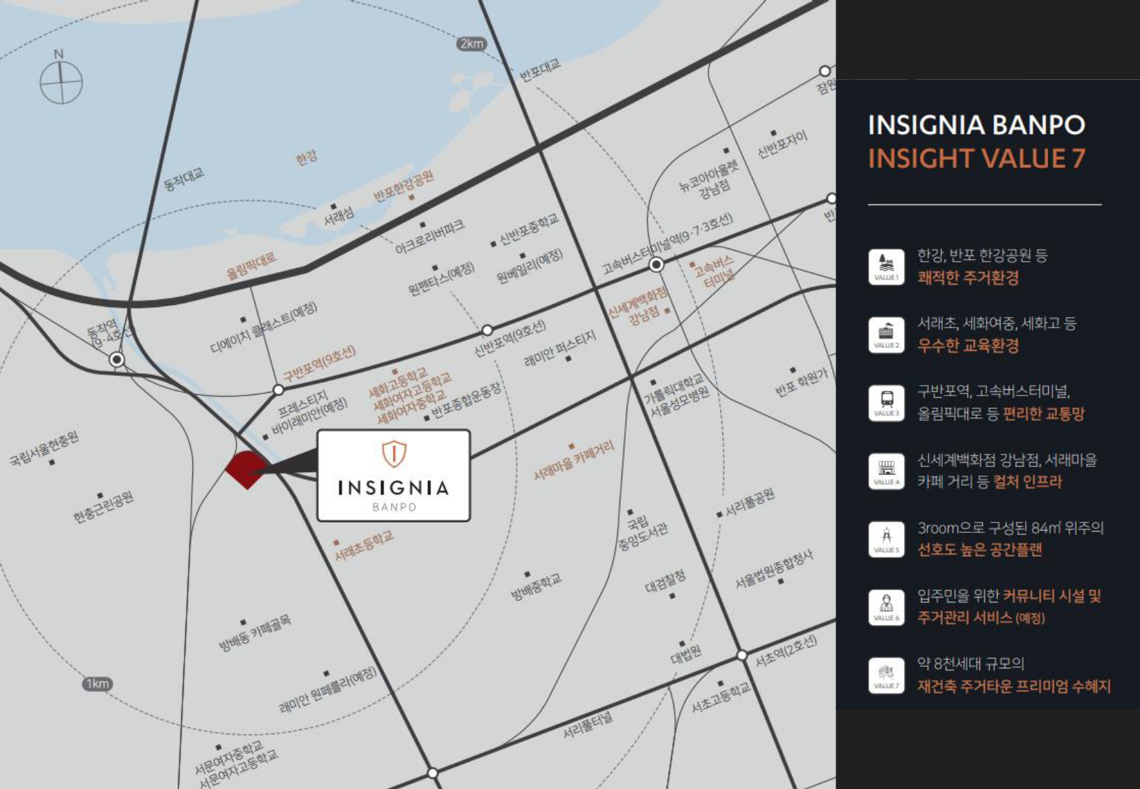 입지면에서는 누구나 인정할 만한 위치라고 자부하는데요. 서래초·세화여중고·신반포중·방배중·서문여고·세화고·반포고 등 명품학군을 품고 있습니다. 고속터미널·신세계백화점(강남점)·서울성모병원·한강공원·현충근린공원 등의 생활인프라의 구축을 통해 편리한 거주환경이 가능한 곳이기도 합니다. 물론, 올림픽대로·동작대교·사평대로·신반포로·동작대로의 간선도로는 서울지역 내로의 편리한 이동과 지하철 4·5호선 및 다양한 버스노선의 대중교통망도 갖추고 있어 거주 희망이 높습니다.