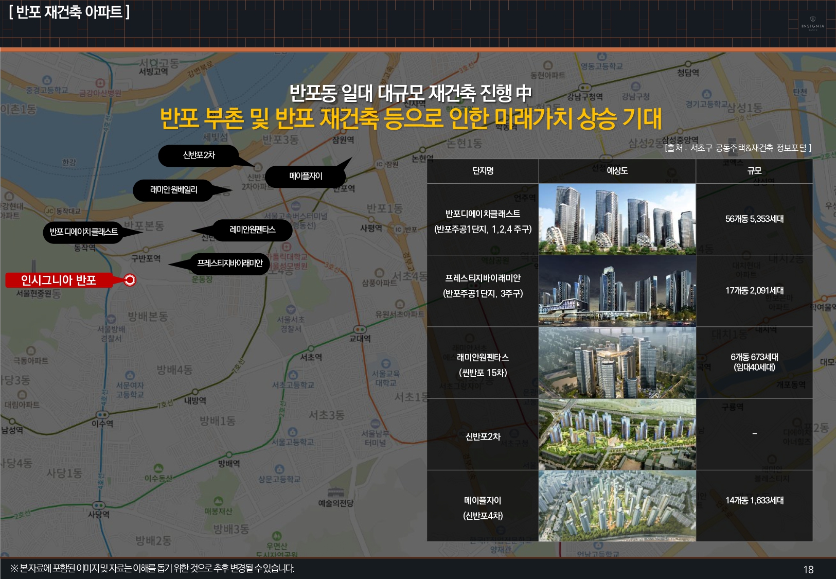 강남의 재건축 단지가 밀집해 있는 반포지역은 프레스티지바이래미안(반포주공1단지 3주구), 디에이치클래스트(반포주공1단지 1·2·4주구), 래미인원펜타스(신반포15차)가 분양 예정에 있으며, 기 분양한 원베일리(2990세대, 2023년 8월예정), 반포르엘(596세대, 2022년 8월예정), 반포르엘2차(280세대, 2022년 12월예정)와 신반포 21차, 22차, 4지구 재건축 등 엄청난 물량의 아파트 단지가 새롭게 건축됩니다.