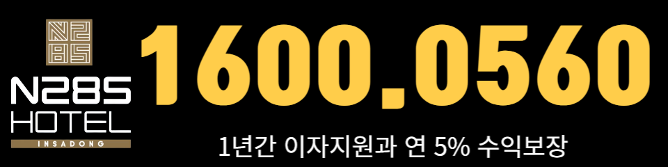 부담감을 낮춘 계약조건과 안정적인 수익성을 가져다줄 수 있는 N285 호텔 인사동은 종로구 삼일대로 423에 위치하고 있으며, 문의(1600-0560)을 통한 상담예약이 가능합니다. 소액투자를 통해 인사동 호텔을 선점할 수 있으며, 호텔 운영에 대한 모든면을 직접 확인이 가능합니다. 객실가동률·매출·정산 등의 내용을 충분히 확인하시고 선택하시면 됩니다.