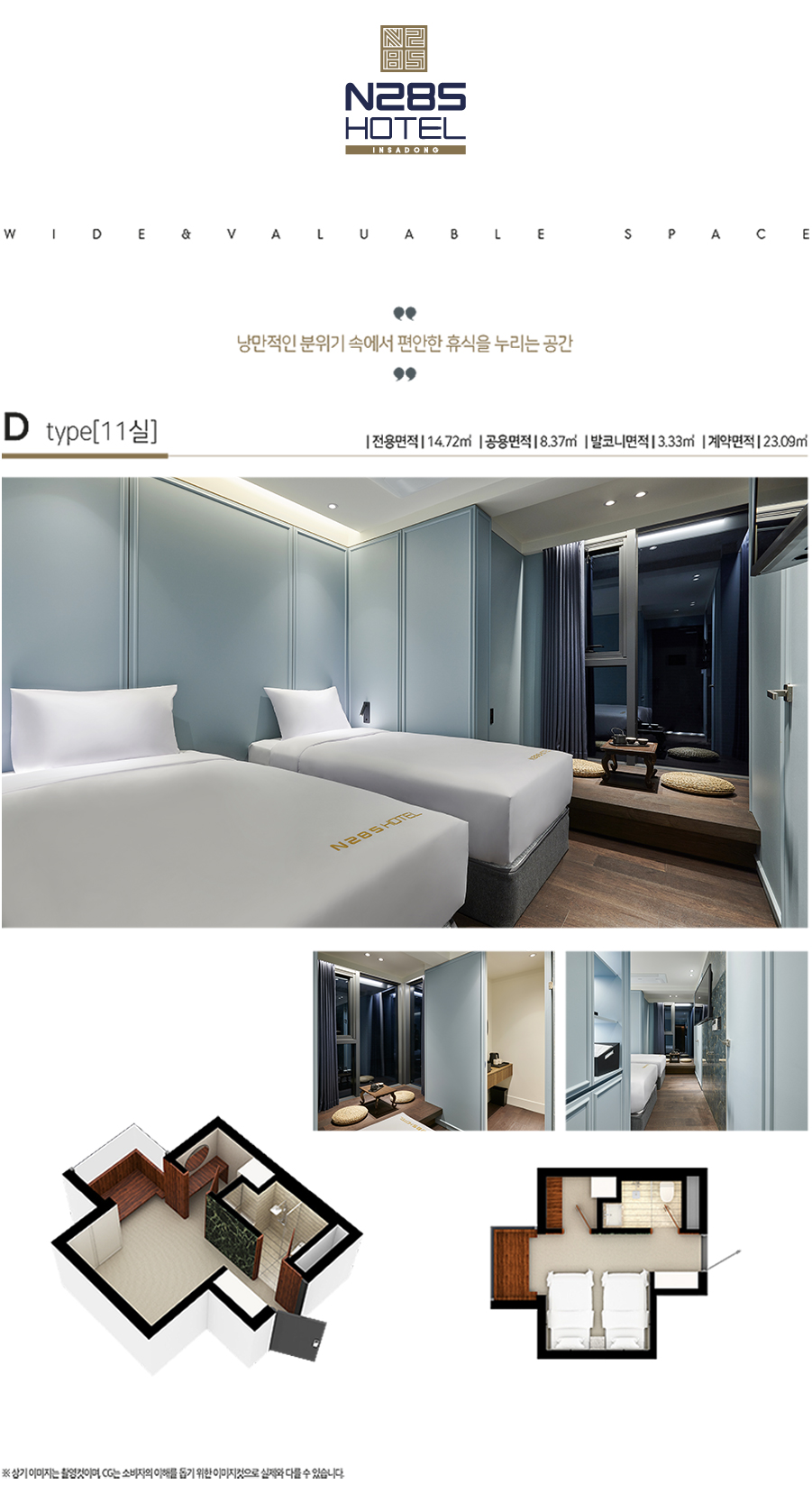 N285 호텔 인사동은 종로구 삼일대로 423에 위치하고 있으며, 지상 12층 규모에 총 121실의 객실과 9호의 근린생활시설로 구성되어 있으며, 객실은 17.73㎡~20.23㎡로 4가지 타입으로 구성되어 있습니다. 해당 호텔은 대규모 숙박시설과 가족단위의 숙박용도가 아닌 1~2인의 숙박용도에 촛점을 맞춘 비지니스 호텔과 비슷하다고 보시면 이해가 빠릅니다.