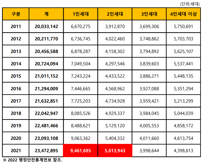 중소형 아파트 대체상품인 본 오피스텔은 늘어가는 1~2인 세대를 위한 맞춤형 주거공간으로서 향후 대표적인 주거 타입이 될 전망입니다. 그 예로, 행정안전부에서 발표하는 2022년 행정안전통계연보를 살펴보면, '21년 말 기준으로 23,472,895세대 중에서 1인세대가 차지하는 비중은 40.3%로 946만 세대입니다. 2인세대는 561 만세대로 23.9%로, 1~2인세대는 1507만 명으로 전체 세대의 64.2%로 10 가구 중 6 가구 이상이 1~2인 세대로 소형화가 되고 있습니다.