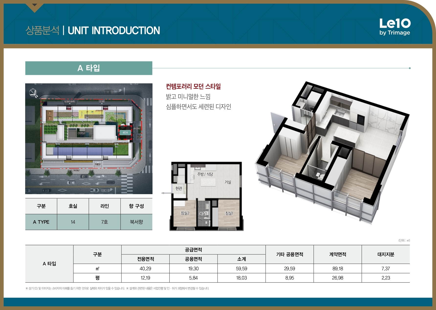 르텐 바이 트리마제는 2 Room과 2 Bath(A타입 제외)의 평면을 통해 투룸의 한계를 극복하고 인테리어 특화 설계를 통해 공간 효율성을 높였습니다. 2개의 스탠더드형과 1개의 스페셜형을 통해 구매자가 원하는 타입을 선택할 수 있도록 하였으며, 어떠한 타입을 선택하더라도 시원한 레이아웃 구성을 우선시하였습니다.